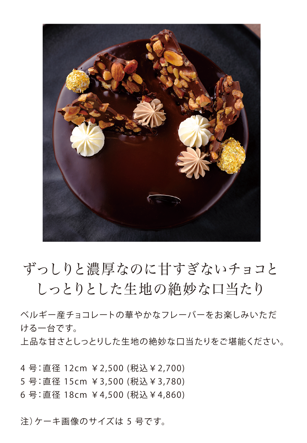 ベルギー産チョコレートの華やかなフレーバーをお楽しみいただける一台です。上品な甘さとしっとりした生地の絶妙な口当たりをご堪能ください。