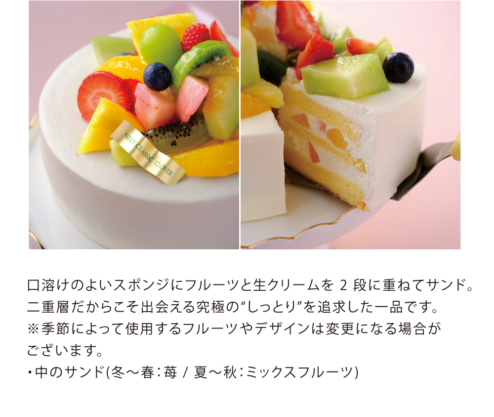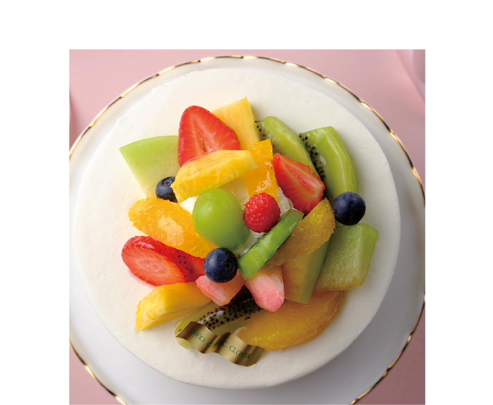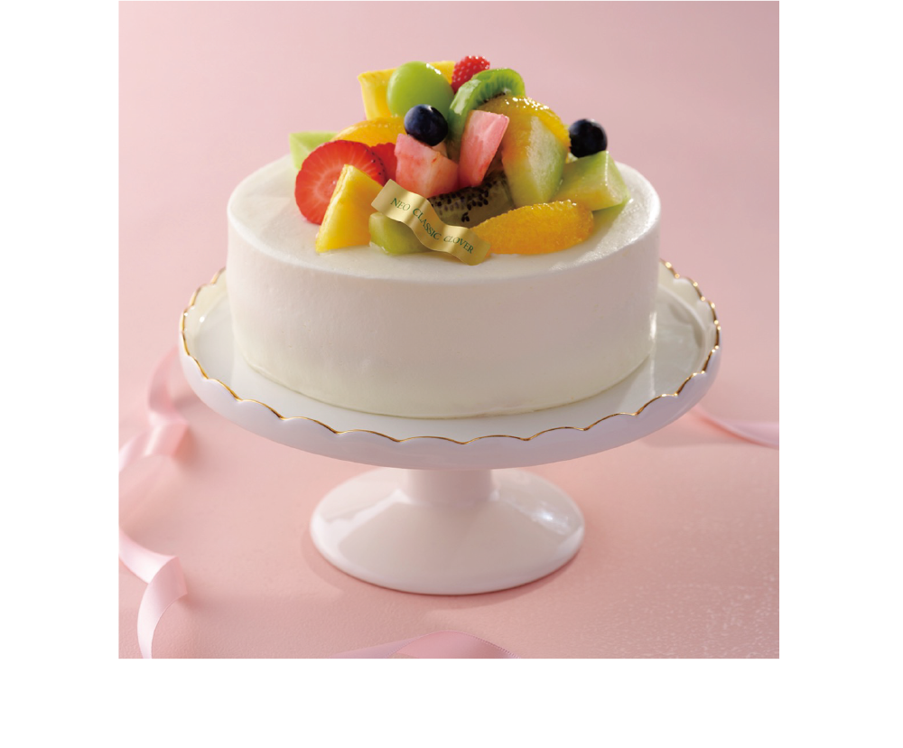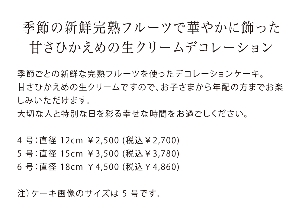 季節ごとの新鮮な完熟フルーツを使ったデコレーションケーキ。甘さひかえめの生クリームですので、お子さまから年配の方までお楽しみいただけます。大切な人と特別な日を彩る幸せな時間をお過ごしください。